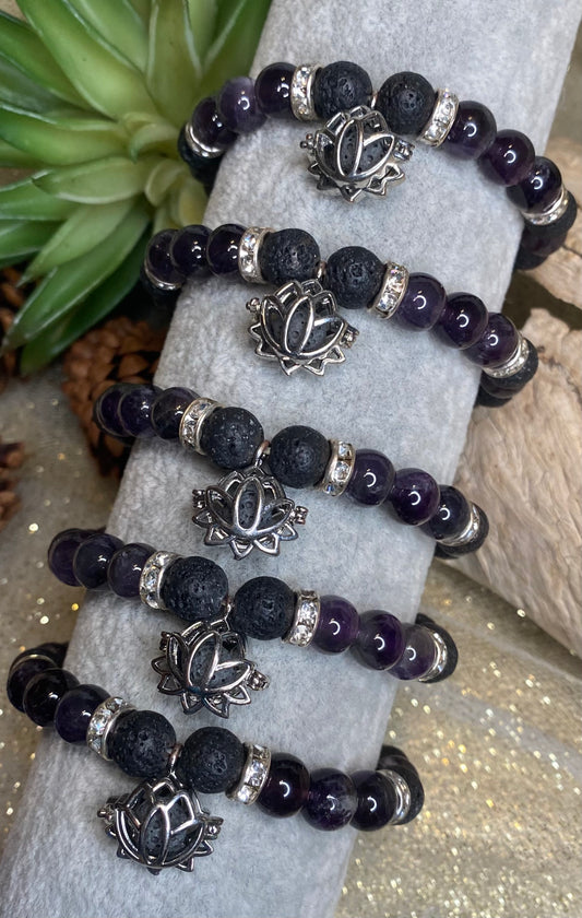Serenity Blooms Amethyst & Lava Aromatherapy Bracelet With Lotus Flower Charm