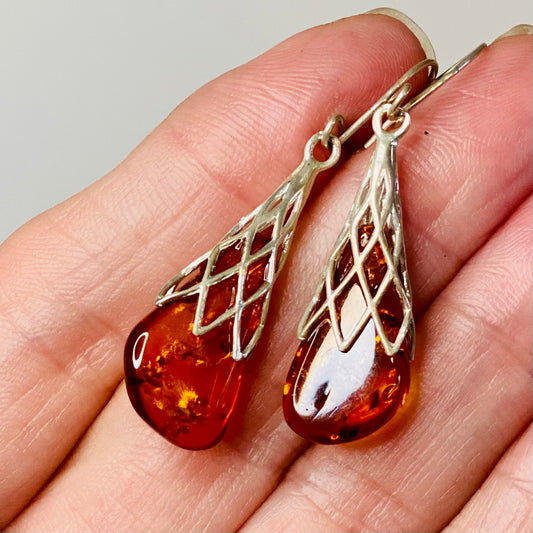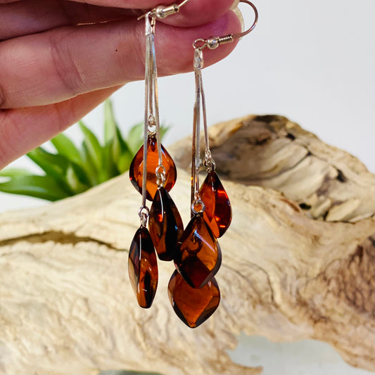 Sterling Silver Amber 3 Stone Teardrop Earrings: Nurturing Energies