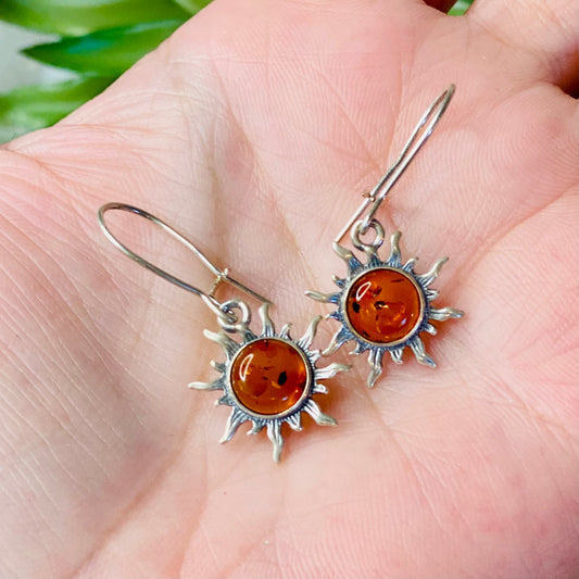 Sterling Silver Amber Sun Earrings: Radiant Healing Energies - small