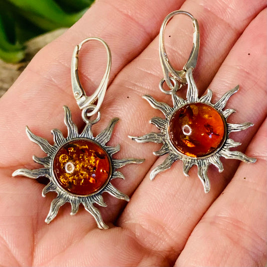 Sterling Silver Amber Sun Earrings: Radiant Healing Energies - Medium