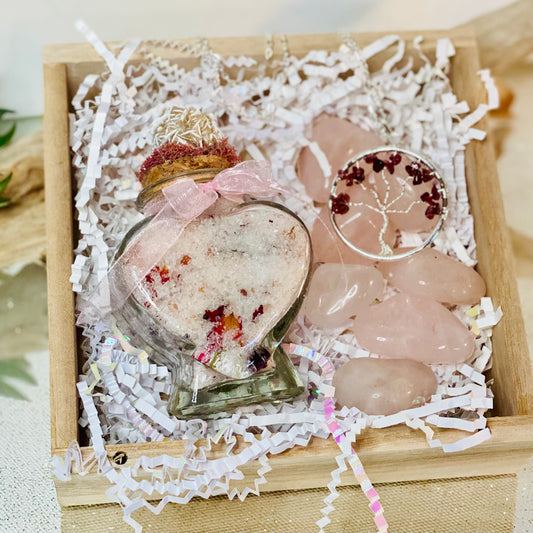 Harmony and Love Gift Set: Heart-Shaped Bath Salts with Desert Rose Crystal, Rose Quartz Tumbled Stones, and Tree of Life Necklace