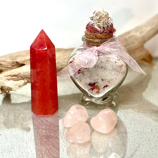 Serenity Gift Set: Custom Bath Salts with Heart-Shaped Crystal Jar, Watermelon Quartz Tower, and Rose Quartz Crystals
