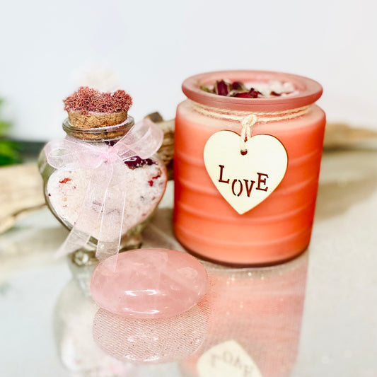 Trio of Love Gift Set: Decorated Love Candle, Heart Jar Bath Salts, Rose Quartz Crystal
