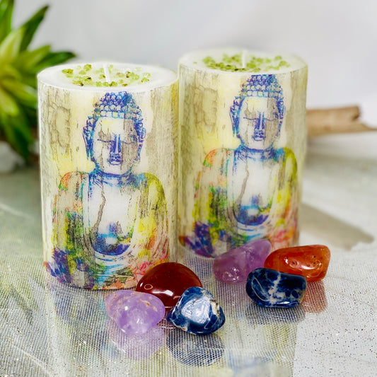 Peridot Buddha Custom Hand-Designed Candles & Crystal Trio Gift Set for Altar Spaces