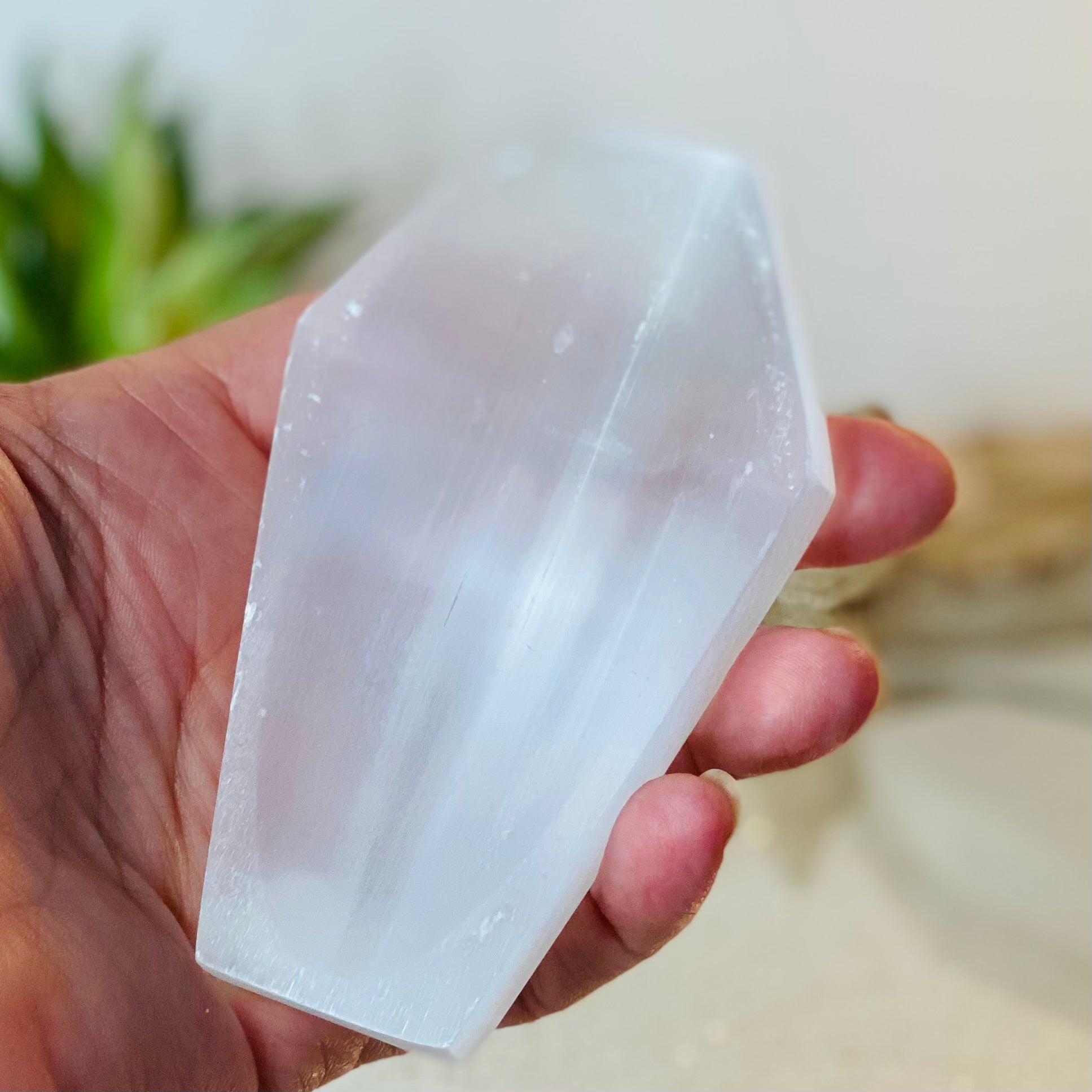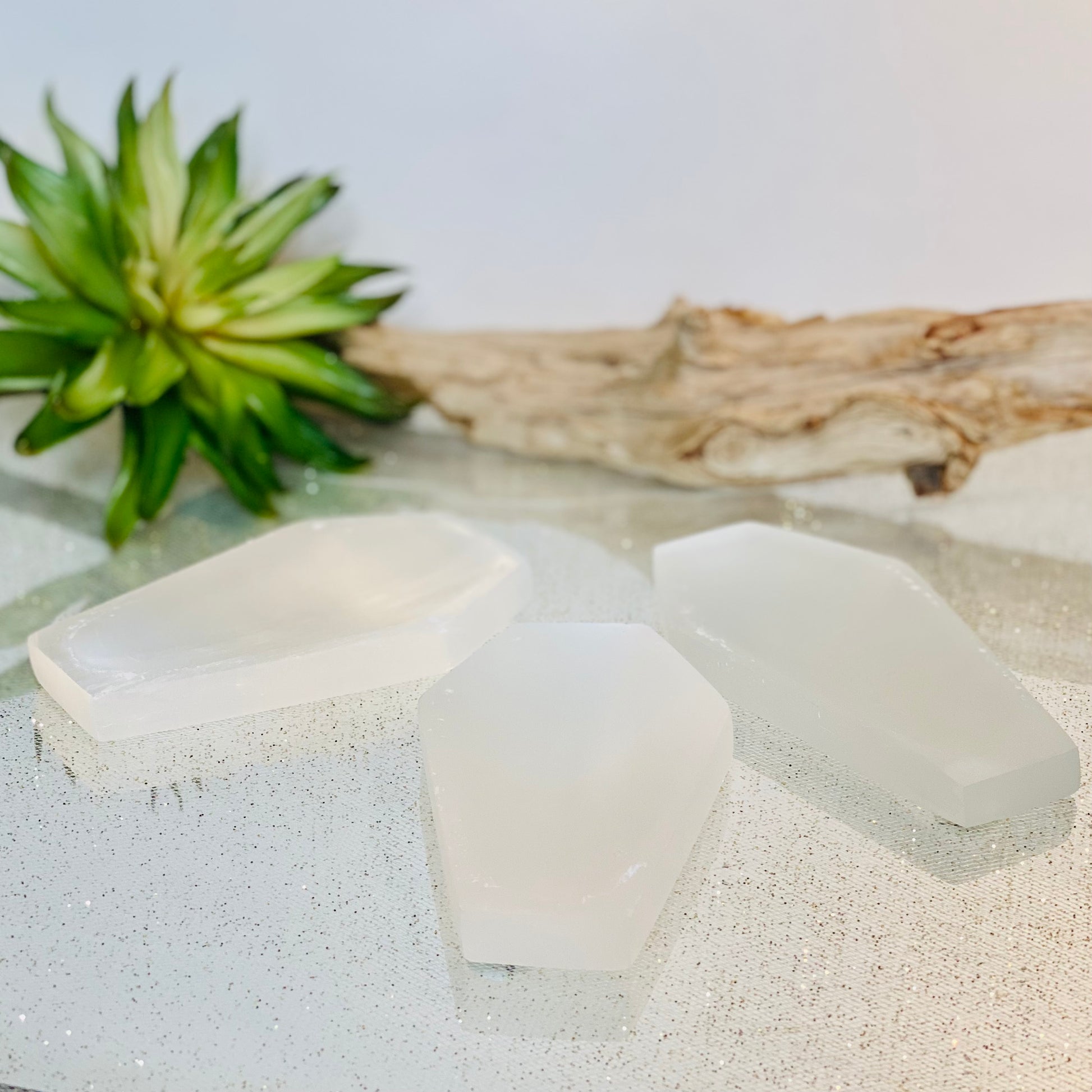 Crafted in the distinctive shape of a coffin, these plates are made from high-quality selenite, known for its purifying and high-vibrational properties. Selenite is revered for its ability to clear negative energies, making it an excellent choice for recharging your cherished crystals.