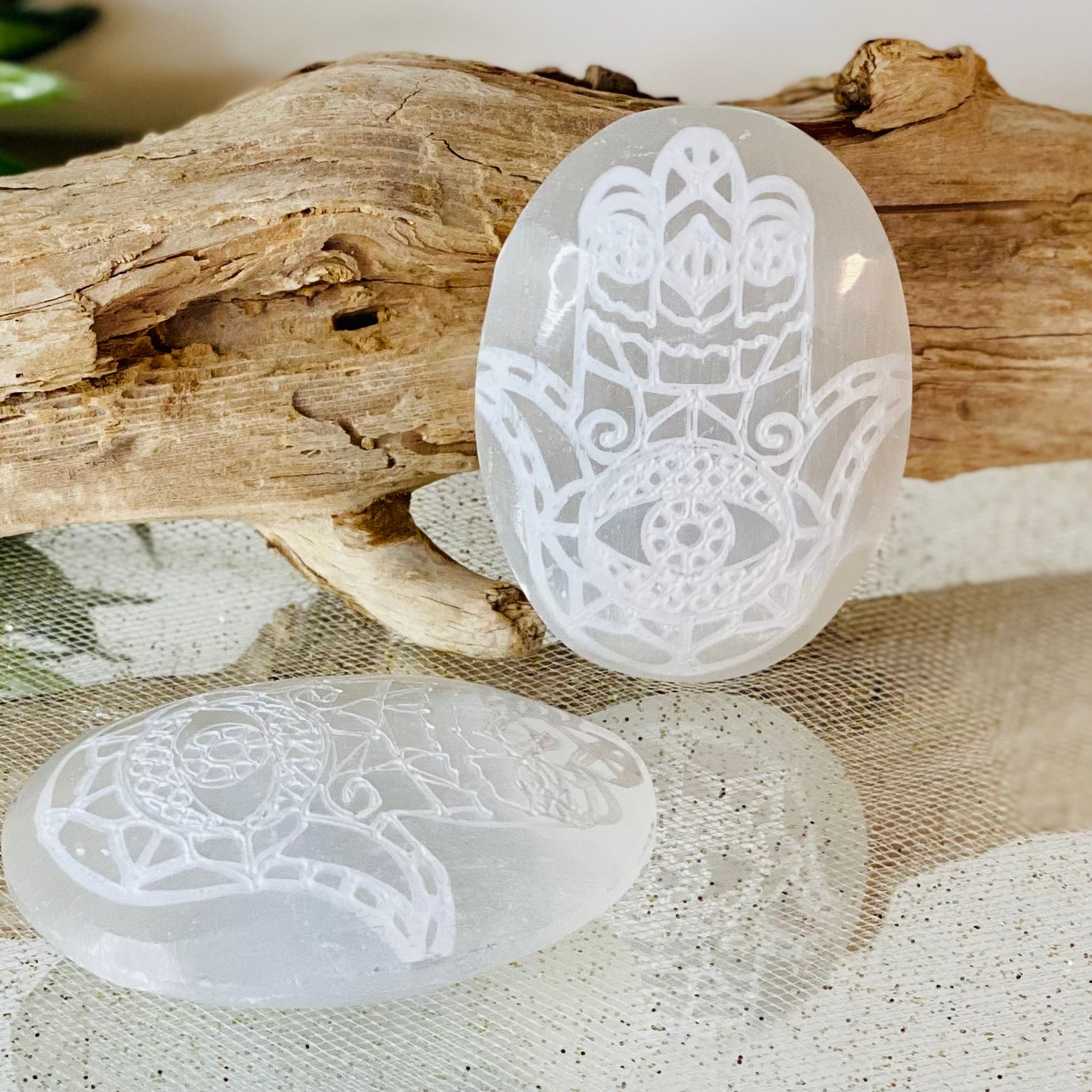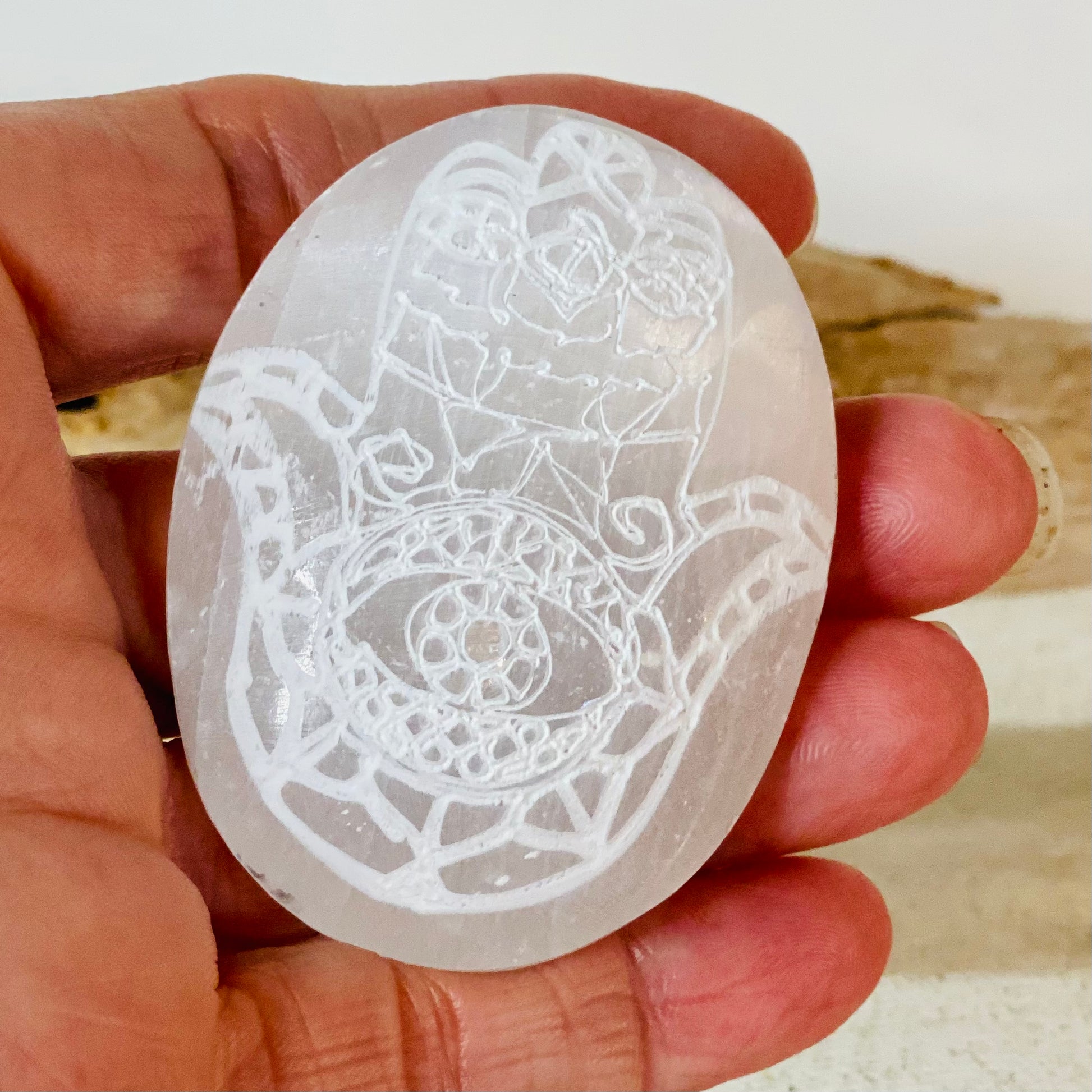 Selenite Hamsa Engraved Small Palm Stones for Harmony and Protection